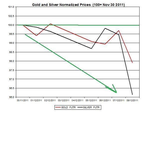 Gold price sharply declined on Thursday by 1.8% to $1,713.4; silver price also sharply declined by 3.34% to $31.54. The chart below shows the development of gold and silver prices during December (normalized gold and silver prices to November 30th 2011). During December gold price declined by 2.1% and silver price by 3.9%.