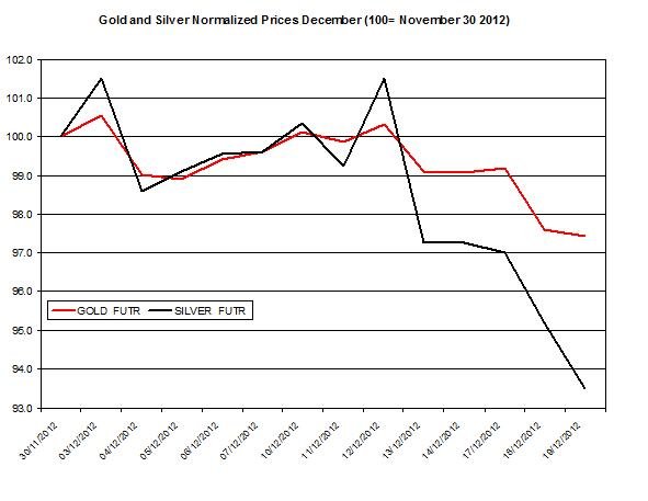In the chart below are the developments in the normalized prices of precious metals during December (normalized to 100 as of November 30th). During recent weeks, the price of silver and gold had a sharp downward trend.