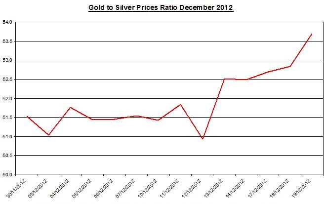 The ratio between the two precious metals rose again on Wednesday to 53.69. During December, the ratio rose by 4.19% as gold out-performed silver.