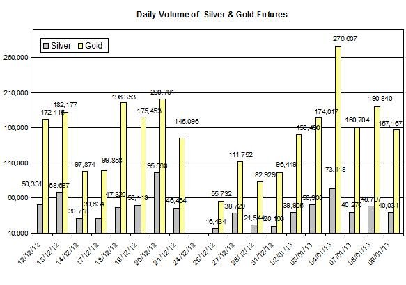 The gold and silver futures volumes of trade have fallen in recent days following the big market awakening after the holiday season. On Wednesday the volume reached 157 thousand and 40 thousand, for gold and silver, respectively. These numbers are lower than the volume traded in the past several days. Due to the forthcoming rate decisions in Europe, the volume might pick up today. If the volume will rise, this could suggest the odds of sudden sharp shifts in the prices of gold and silver due to high volume will decrease. The chart below shows the volume of trading gold and silver futures in the CME in recent weeks.