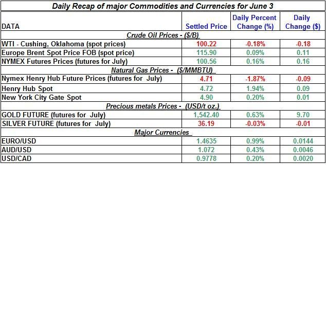 Here is a summary of the main price changes in energy commodities and precious metals for June 3rd: