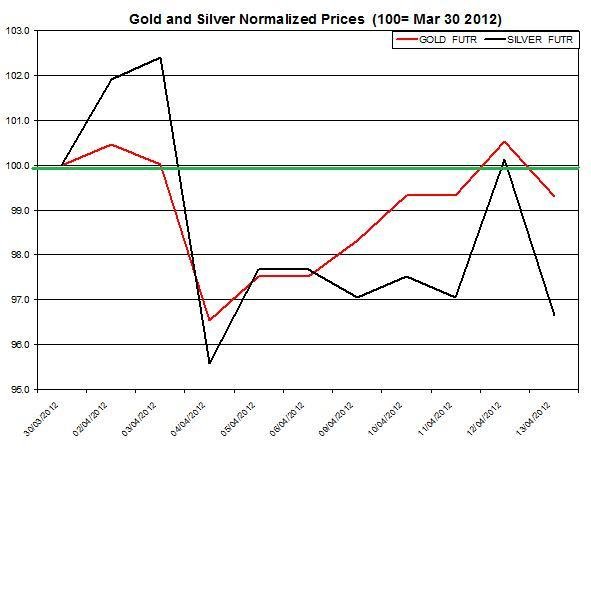 The chart below presents the movement of gold and silver prices during the month (prices are normalized to March 30th).
