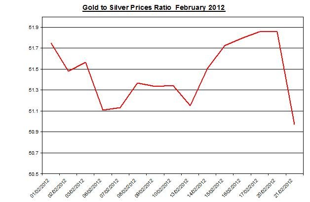 Gold price & silver prices 2012 February 21The ratio between gold and silver sharply decreased on Tuesday, February 20th at 50.97. During February the ratio slightly declined by 2.59% as silver has moderately outperformed gold. In the chart below you can see the changes in this ratio during February.
