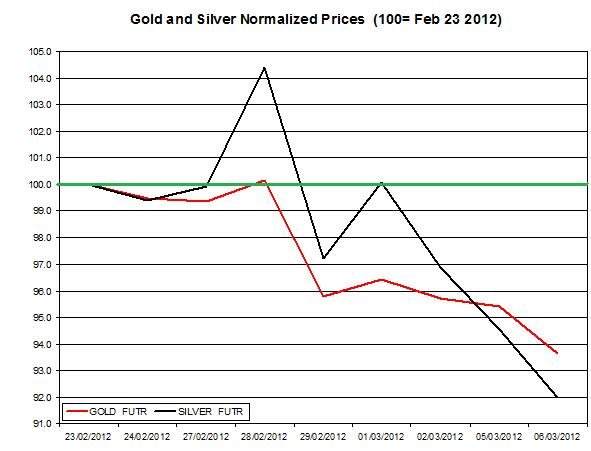 The chart below shows the downward trend of gold and silver during the last couple of weeks (prices are normalized to February 23rd).