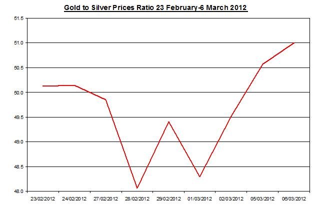 The ratio between gold and silver rose on Tuesday, and reached 51.01. During the month the ratio rose by 3.25% as gold has moderately outperformed silver. In the chart below are the developments in this ratio during the last few weeks.