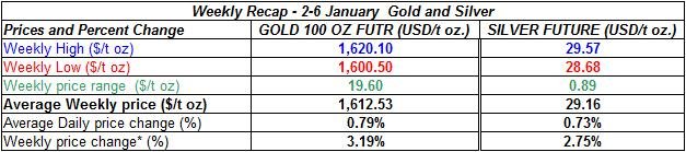 Here is a short review of the changes in gold and silver prices during the week of January 2nd to January 6th 2012: