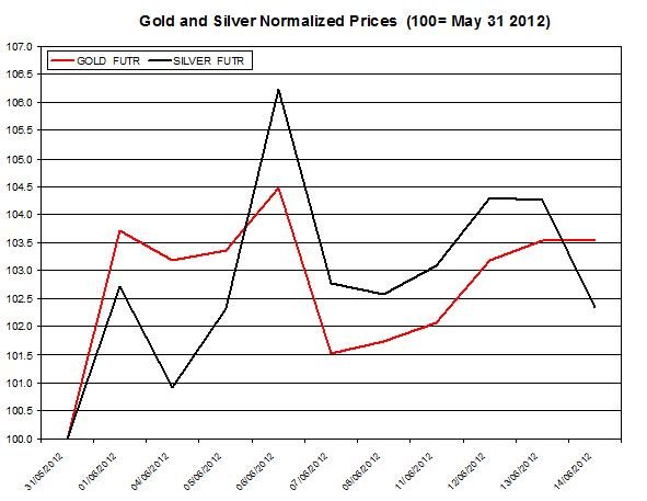 The chart below presents the normalized rates of these precious metals during the month (normalized to 100 as of May 31st).