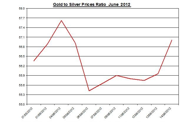 The ratio between the two metals sharply increased on Thursday to 57.01. During the month the ratio rose by 1.17 as silver has slightly under-performed gold.
