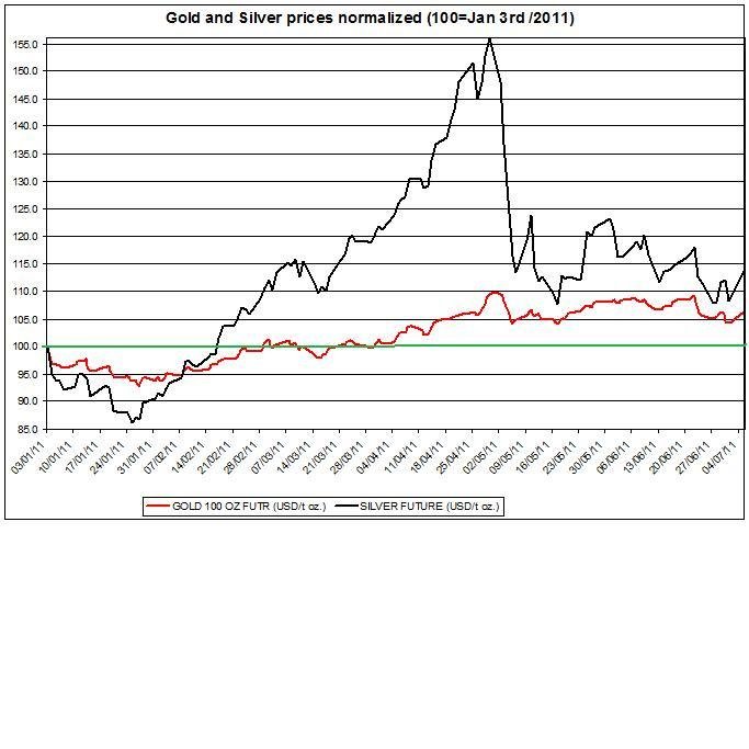 The chart below shows the normalized gold and silver prices (January 3rd 2011=100). It shows, that despite the falls in gold and silver prices in recent months, gold price rose during 2011 by 6.31% and silver price by 13.77%.