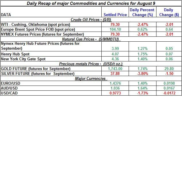 Here is a summary of the price movements of precious metals and energy commodities for August 9th: