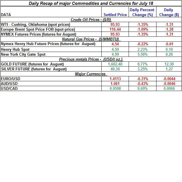 Here is a summary of the price movements of precious metals and energy commodities for July 18th: