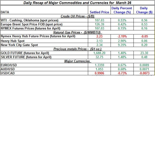 Here is a summary of the changes in precious metals and energy commodities for March 26th, 2012: