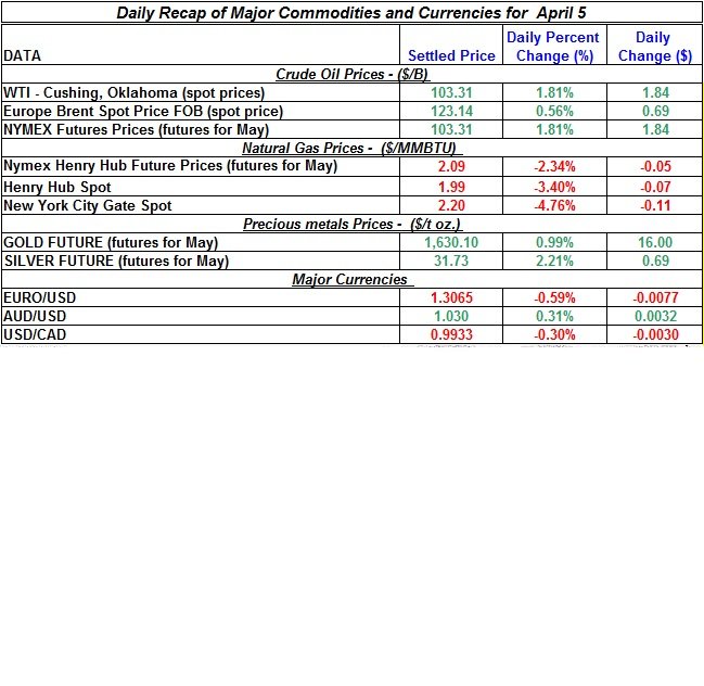 Here is a summary of the changes in precious metals and energy commodities for April 5th, 2012: