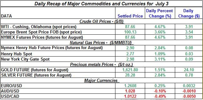Here is a summary of the daily changes in precious metals and energy commodities for July 3rd, 2012: