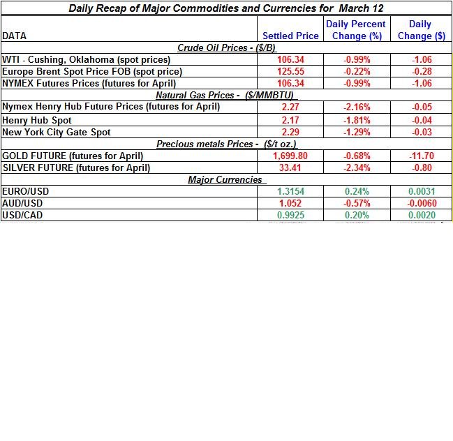 Here is a summary of the changes in precious metals and energy commodities for March 12th, 2012: