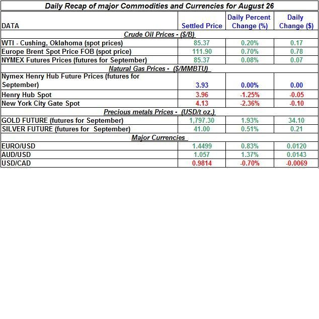 Here is a summary of the price movements of precious metals and energy commodities for August 26th: