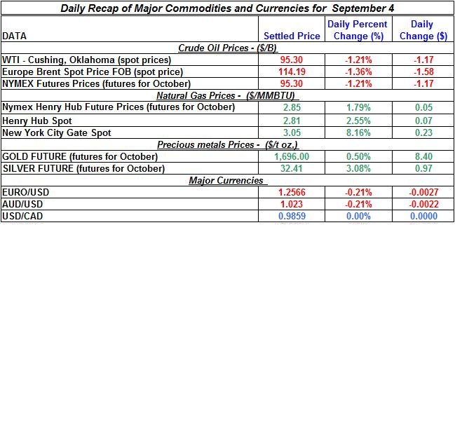 Here is a summary of the daily changes in precious metals and energy commodities for September 4th, 2012: