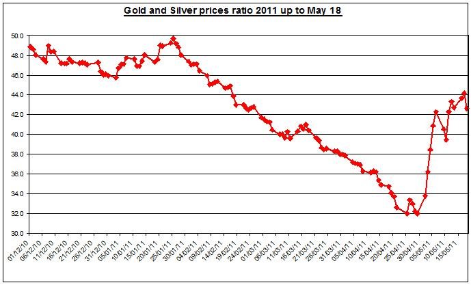 The gold to silver ratio: As of Wednesday, May 18th the ratio between gold and silver prices fell to 42.69. The ratio could be interpreted as one troy ounce (31.1 gram) of gold is worth 42.69 troy ounces of silver.