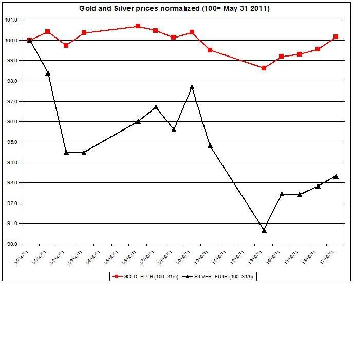 The chart below shows the normalized gold and silver prices (May 31st 2011=100).