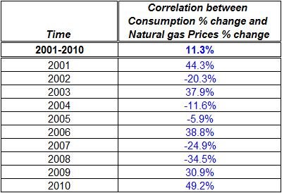 In the table above is the correlation between the monthly percent change in consumption and percent change in prices of Natural gas. It shows that for the entire period the correlation is very low – only +11%, however it’s because there are different set of correlations, sometime positive and sometime negative which cancel one another. E.g. in 2008 there was a -34% negative correlation, while in 2010 there is a 49% positive correlation. Therefore, at first glance, the relationship of these two indictors isn’t very stable or reliable.