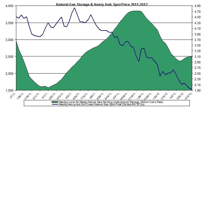 In the following graph are the weekly changes in natural gas storage (and Henry Hub spot price for 2011-2012. During the previous week the Henry Hub spot price decreased by 2% to a weekly average price of $1.93/mmbtu – the lowest price level in over two years. Furthermore, the Henry Hub price was $2.19/mmbtu below its price during the same week in 2011.