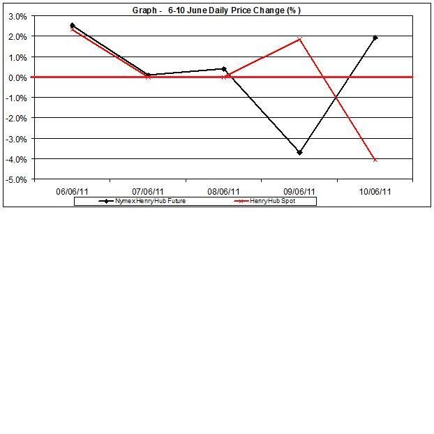 The following chart shows the daily changes of natural gas prices (Henry Hub) and futures prices (Nymex Henry Hub) in $/mmbtu during June 6 to 10.