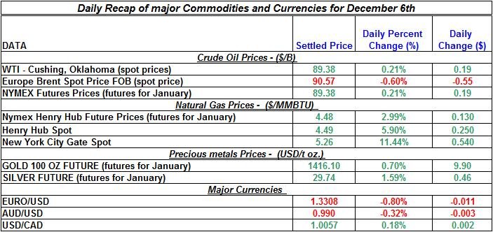 In the following table are the main descriptive data from last business day – December 6th including: settled prices, the daily percent change compare to previous business day, and the quantitative change in US dollars of each of these prices and exchange rates (except for USD/CAD, in which the change is in Canadian dollars):