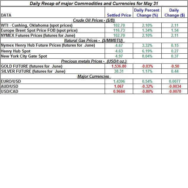 Here is a summary of the main price changes in energy commodities and precious metals for May 31st: