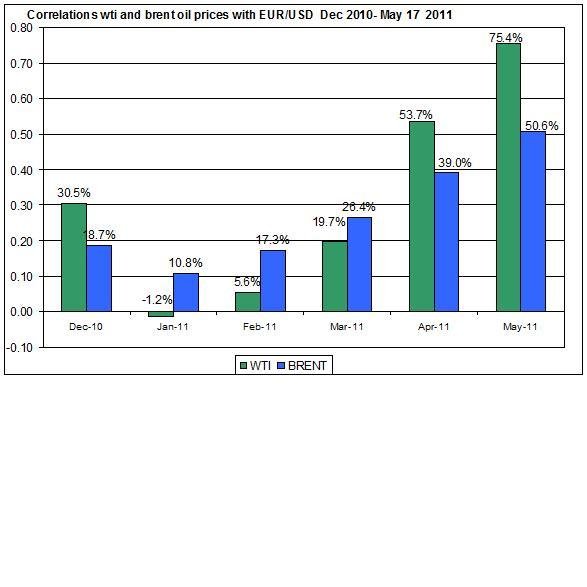 During May, there is still a very high linear correlation between the daily changes of crude oil prices and EURO/USD.
