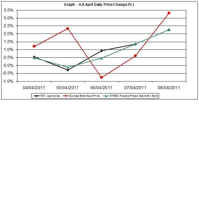 The following chart preset the trend of WTI spot price, NYMEX Futures Prices (May delivery) and Europe Brent spot price during the preceding week: