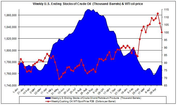 The chart below presents the petroleum and oil stocks levels compared to the WTI crude oil prices during 2010-2011.
