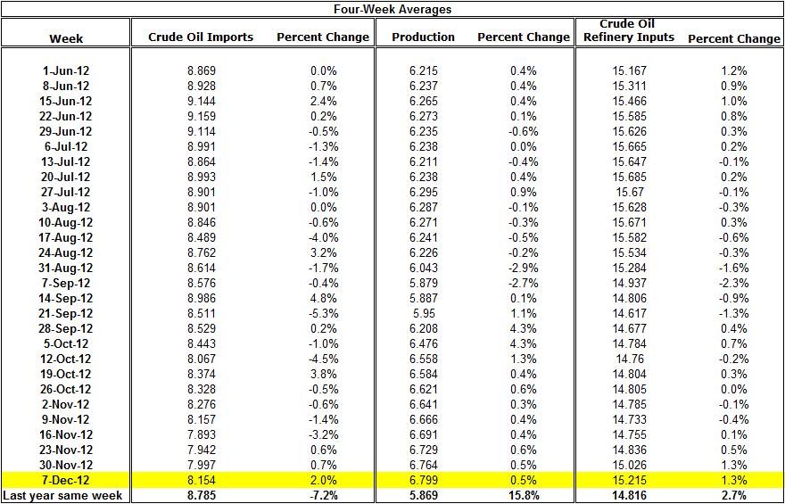 The four week average of U.S. production (million of barrels a day) for the week of December 7thincreased to 6.799; it is also 15.8% above the average production at the same week in 2011.