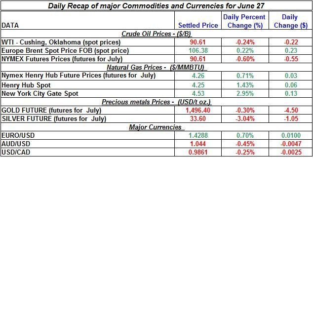 Here is a summary of the price movements of precious metals and energy commodities for June 27th: