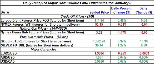 Here is a summary of the daily developments of precious metals and energy commodities for January 8th, 2013: