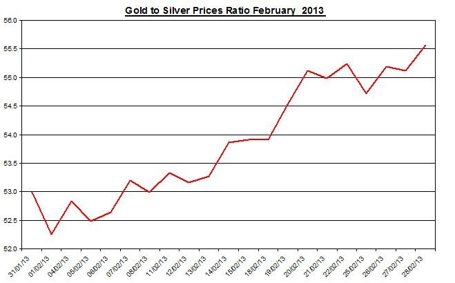 The next chart shows the movements in the ratio of gold to silver (gold price/silver price) during last month; the ratio had an upward trend. The ratio rose as silver price has under-performed gold price. During February the ratio ranged between 55 and 52.5.