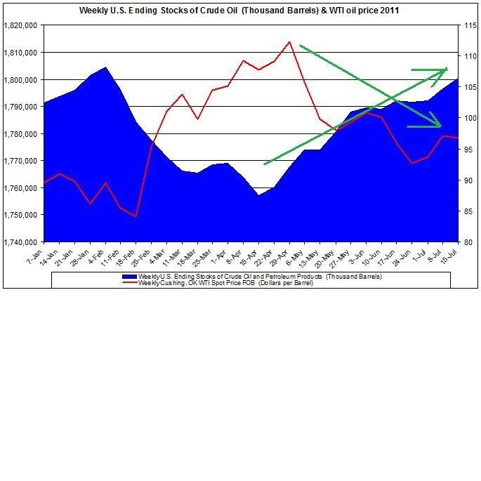The chart below shows the petroleum and oil stocks levels compared to the WTI crude oil prices during 2011.