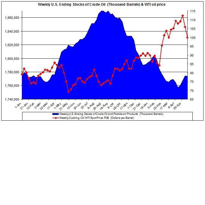 The chart shows the current low petroleum and oil stocks compared to the same time during 2010; furthermore, the WTI spot oil prices is also very high compared to the same time last year, but at least there is decline in recent weeks. The linear correlation of these two data series (their weekly percent changes) is at -0.18, while their data series (the trend) have a -0.89 linear correlation.
