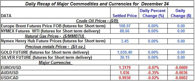Here is a summary of the daily developments of precious metals and energy commodities for December 24th, 2012: