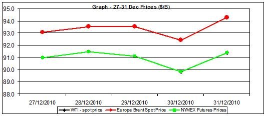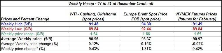 The table above shows moderate rises of oil prices as the WTI crude oil price ranged between 89.89 $/b and 91.48 $/b – a range of 1.64$/b, which is a bit lower than last week’s range. This fluctuation represents a decrease in the volatility of crude oil price compare to last week, which could be due to the low volatility as the year wsa winding down.