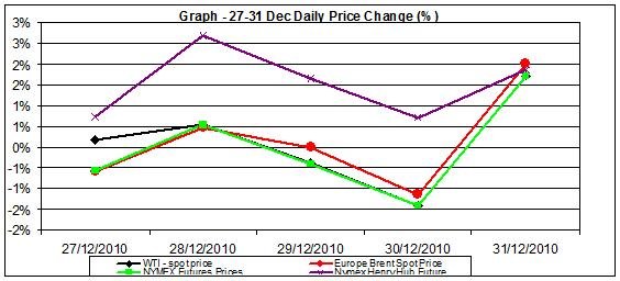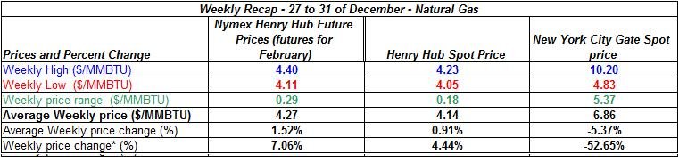 Last week was characterized with an upward trend for crude oil price and natural gas spot price (except for New York City Gate Spot); here is a weekly recap on major energy commodities for the last week of the year, December 27-31: