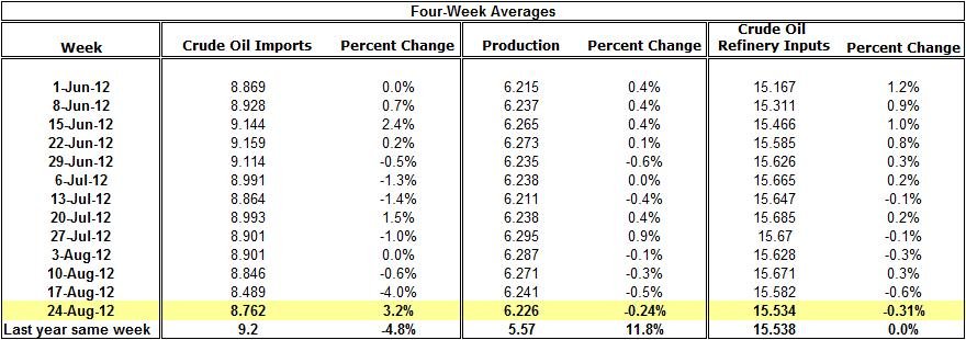 The four week average of U.S. production (million of barrels a day) for the week of August 24th decreased to 6.226; it is still 11.8% above the average production at the same week in 2011;