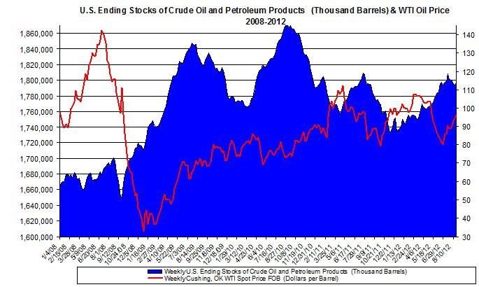 The chart shows the changes of petroleum and oil stockpiles and WTI crude oil price between the years 2008 and 2012. During the last couple of years the lagged linear correlation between WTI oil price and current oil stockpiles was -0.176.