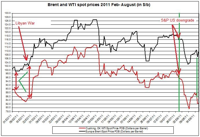 The chart below presents the price development of WTI spot oil and Brent oil during February to August. It shows the price hike in Brent and WTI oil prices as the Libyan war started and the sharp fall in oil prices at the beginning of August when S&P downgraded US credit rating.