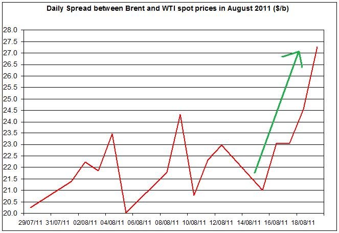 The premium of Brent oil over WTI spot oil sharply inclined again on Friday August 19th to $27.27/b – the widest gap between these two oil prices; during August this premium rose by 34.67%, mainly because WTI spot oil price declined by a sharper rate than Brent oil price did. The recent news from Libya might ease the rise of Brent oil and bring down the premium of Brent oil over WTI.