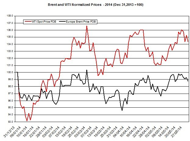 In the chart below are the daily shifts in WTI and Brent oil prices during the past several months (prices are normalized to December 31st, 2013).