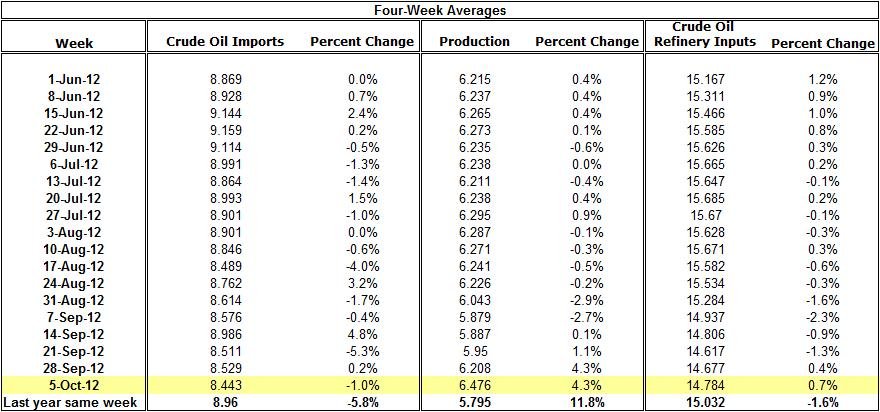 The four week average of U.S. production (million of barrels a day) for the week of October 5th increased to 6.476; it is also 11.8% above the average production at the same week in 2011.