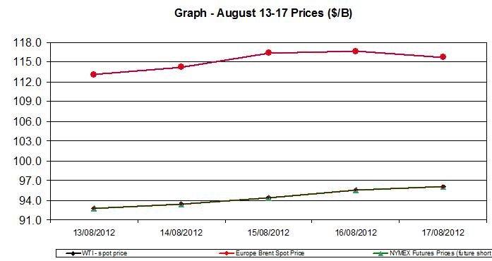NYMEX Oil Future (short term delivery) also increased by 3.38% during the week, and reached $96.01/b by Friday, August 17th.