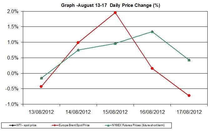 Crude oil prices continued their upward trend during most of last week as both WTI and Brent oil prices rose on a weekly scale. Further, the gap between Brent and WTI also expanded during most of the week. The recent news of the contraction in the EU GDP by 0.2% during Q2 2012 may have curbed the rise in oil prices. In the U.S the financial reports showed a mixed signal as to the progress of the economy: the Philly Fed index was still negative, while the retail sales edged up during July.