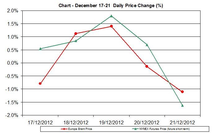 In the following charts (for the week ending on December 21st) are the daily shifts in NYMEX WTI future (short term delivery) and Brent oil: