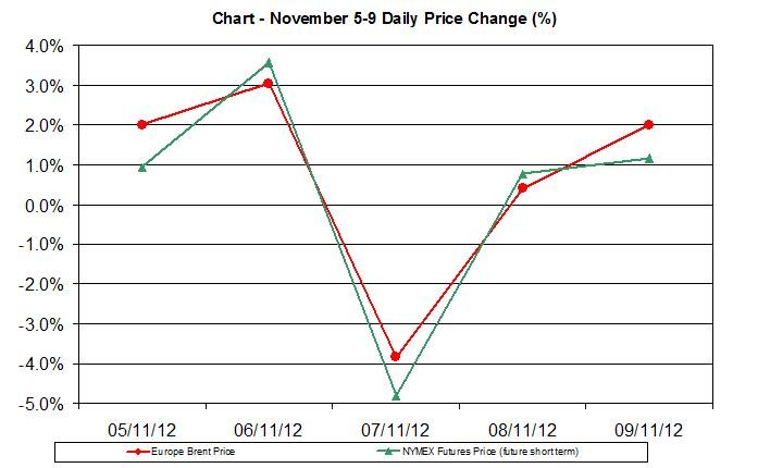 In the following charts (for the week ending on November 9th) are the daily shifts in NYMEX WTI future (short term delivery) and Brent oil: